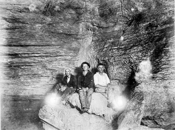 | The two traditional legends concerning Rockhouse Cave involved the story of the Spanish gold buried there (see: Caves of Missouri), and that there used to be a "bottomless pit" in which folks would toss rocks and "never hear them hit." The gold legend is somewhat supported by the existence of Spanish writing, the words "Aqui Es" ("Here it is") and an arrow on the wall of a small, almost never-visited cave near Rockhouse Cave, called "Spanish Cave." Sig Reno, it is said, once threw something down into the "bottomless pit" and "it came out at Roaring River," proving the subterranean connection between the two. Old-timers also say there used to be another, and larger, cavern passage which is no longer accessible, which led to an underground lake via a passage "large enough in some rooms to fit a house." One person reported catching blind fish in the lake and letting down "100 feet of line.” The Spanish gold legend is also supported by the map owned by William G. Carlin who appeared at the cave one day in 1930. Bill Bryant told that he helped Carlin find a stone with an X on it, marking the cave as the site of the buried Spanish gold. Thereafter, Carlin took out a contract with John England giving him half of "all gold, silver, lead, copper, and all other minerals or treasures that may be discovered ... " (Sept. 2, 1930). Carlin, however, never returned to mine the cave and his map remains a mystery. In 1972, shortly after the Renos sold to Thompson, someone dynamited the cave looking for the gold. The bottomless pit was blocked, and the "lost passage" was also apparently sealed off at that time. Old-timers entering the cave today remark that much fallen slabs and rocks didn't used to be there. Stella Nafus recalled coming to Rockhouse Cave in a horse and buggy in the early 1900's while courting. The earliest graffiti in the cave is from 1889, the names, date and birthdates of 17 year old Howard and McGraw boys. The name of Sarah Wilder is carved by the mouth, dating from around 1883-1903. One rock wall, called "daterock" holds the names of visitors for one hundred years. It is clear that Rockhouse Cave has been visited continuously since around 1860, and it remains an attraction enjoyed by many today, those who like to "go caving," and those who just wish to "look around." Rockhouse Cave is a living link to a most colorful past, a heritage to be preserved, and Barry County's oldest continuing natural attraction. |